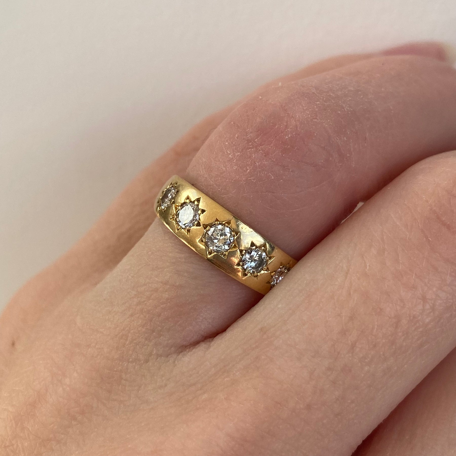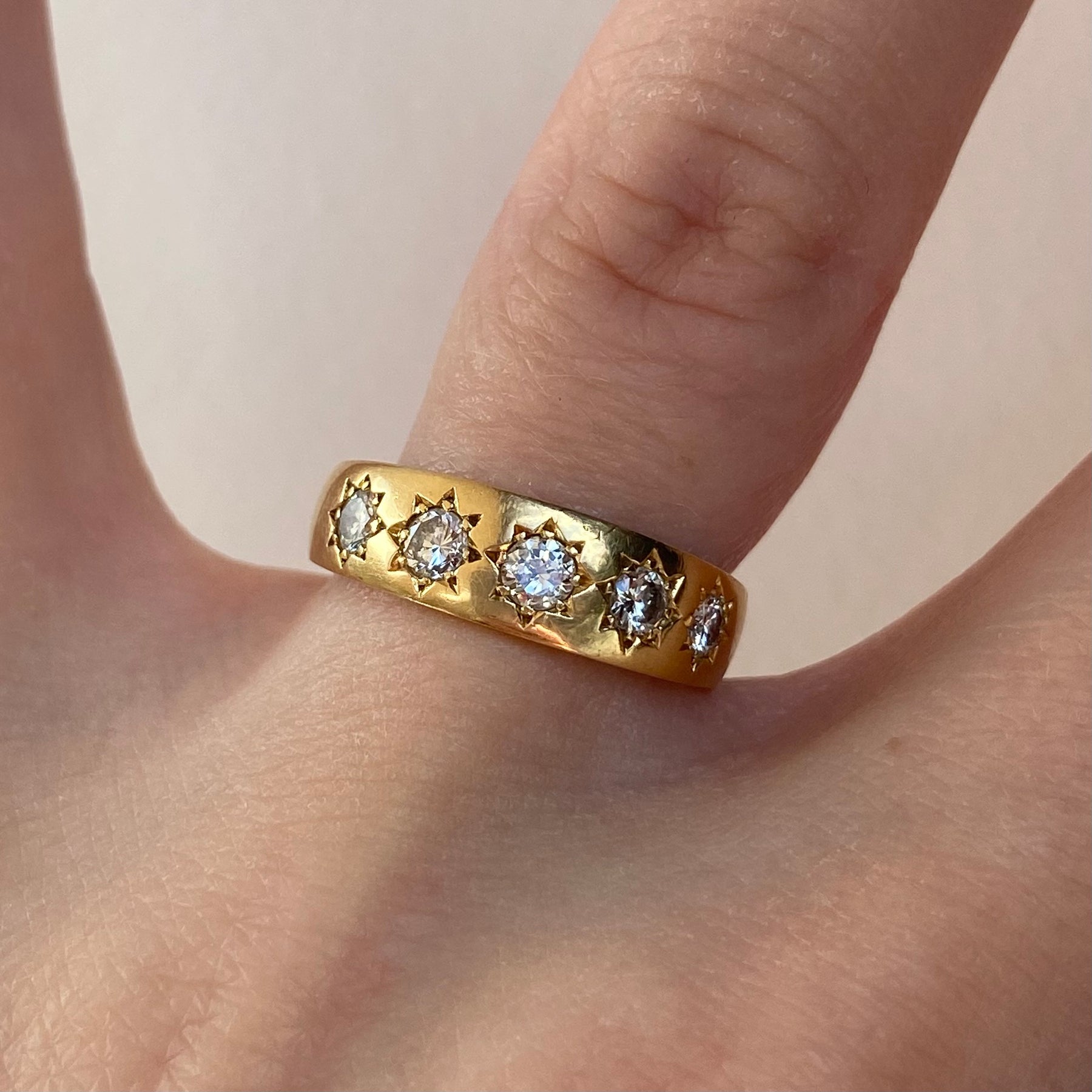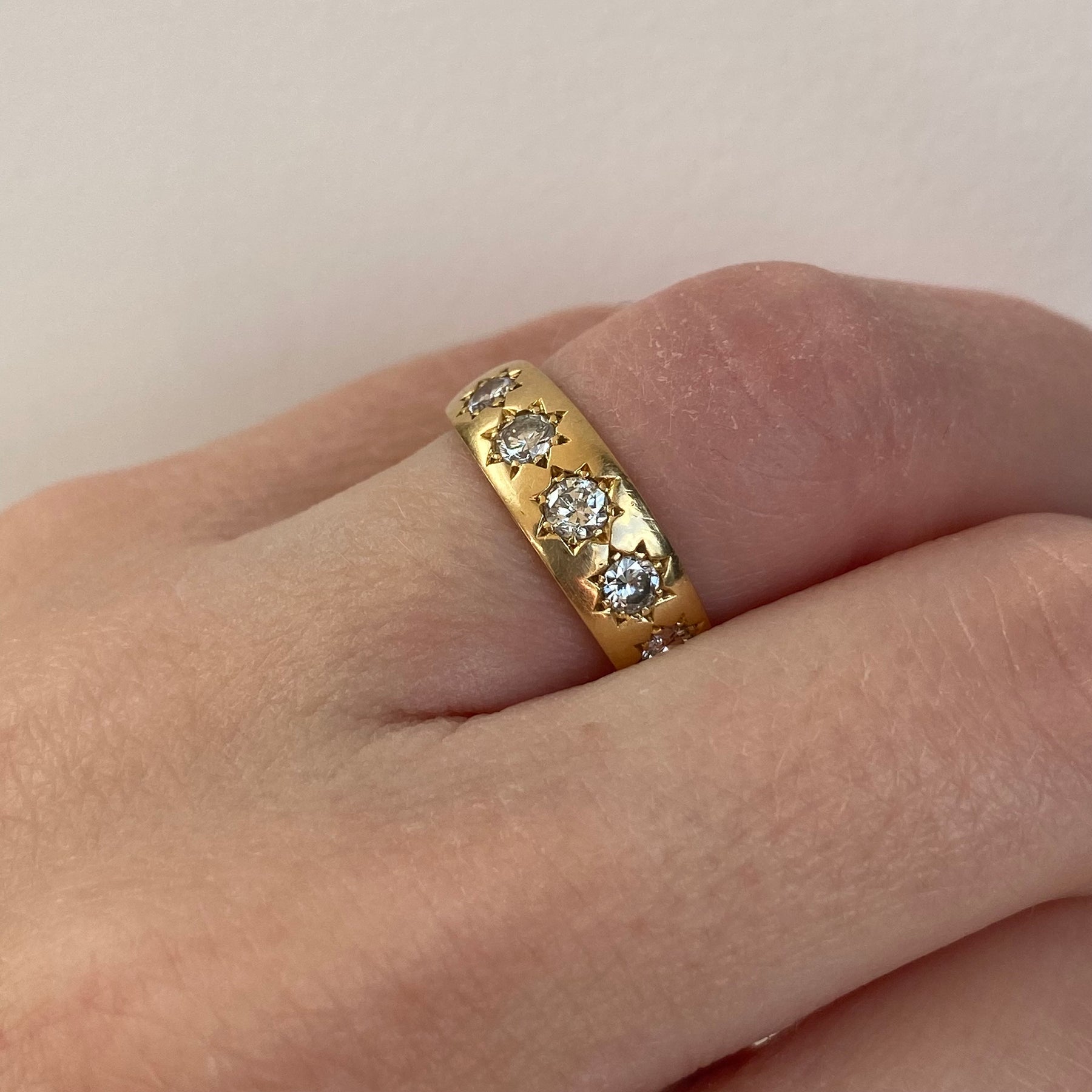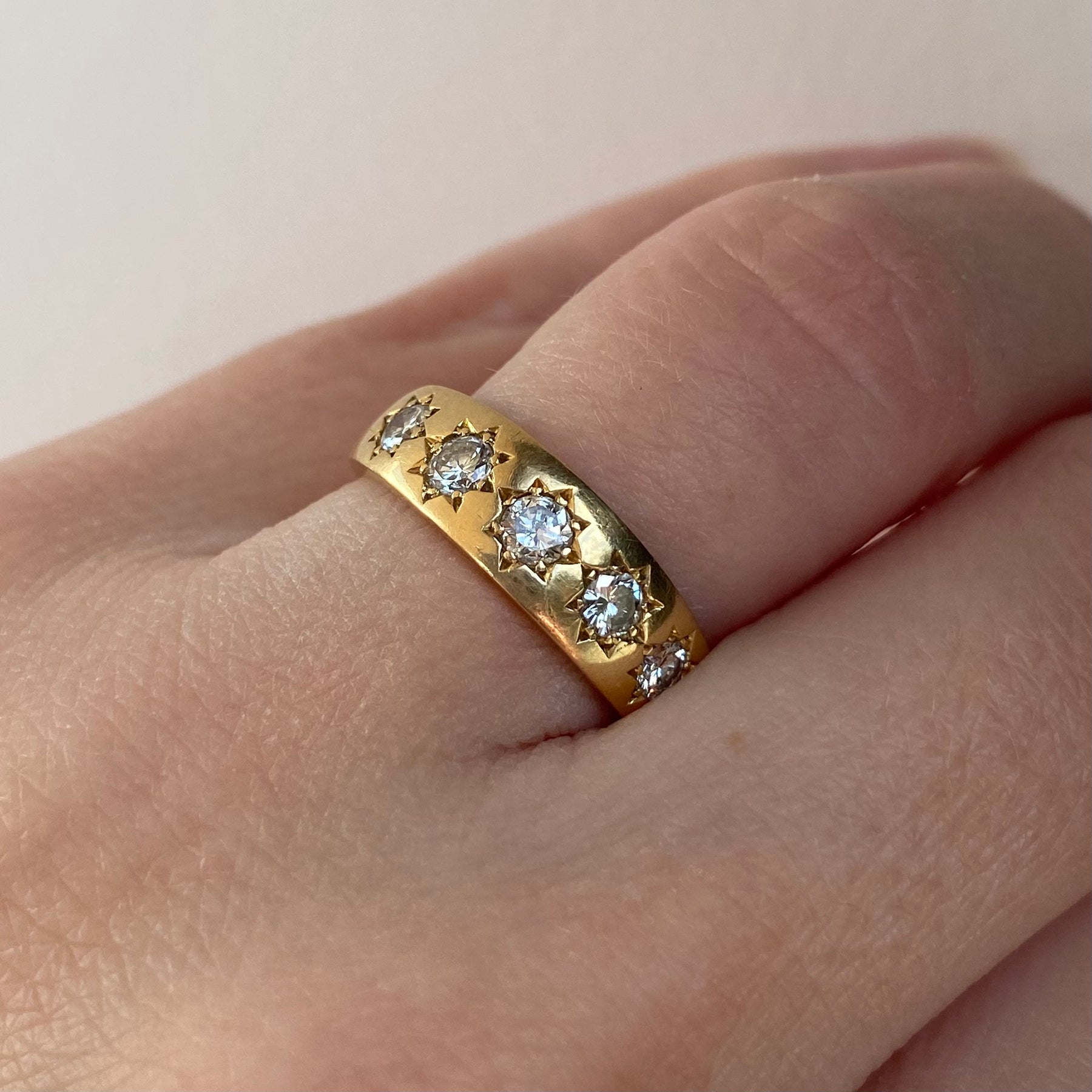 An 18ct gold vintage band ring set with five large, sparkling diamonds held within finely defined star settings across the front. The starburst detailing is exceptionally crisp, showcasing the quality of the craftsmanship and giving the ring wonderful character.