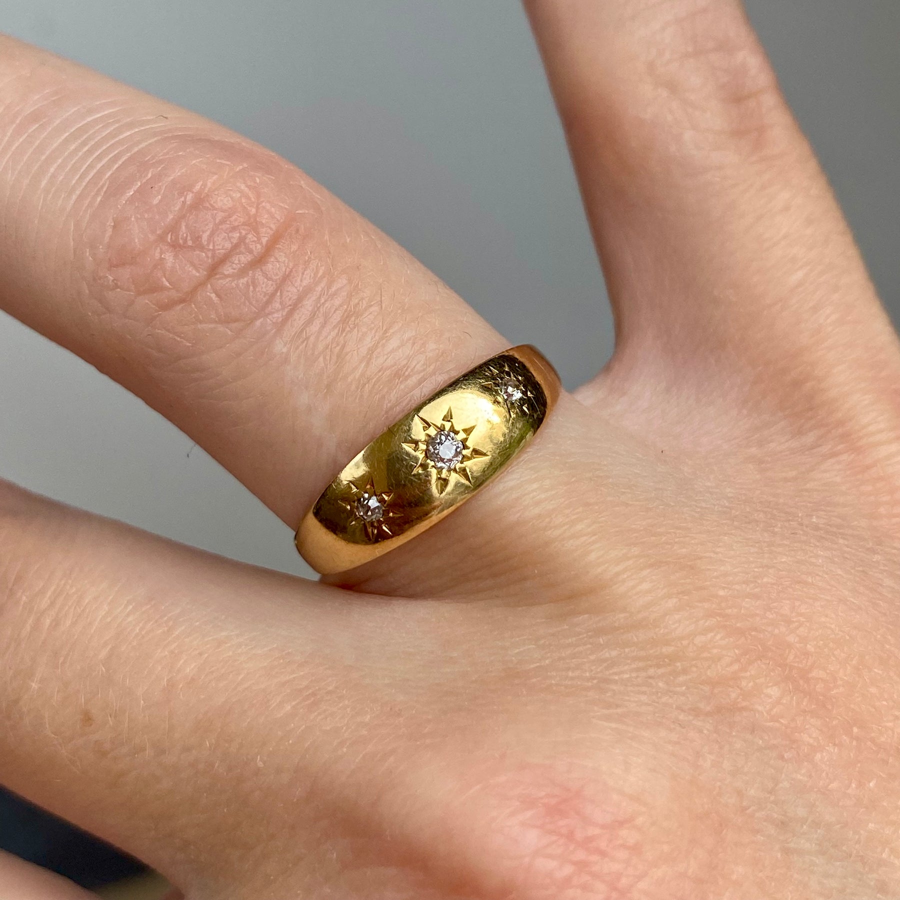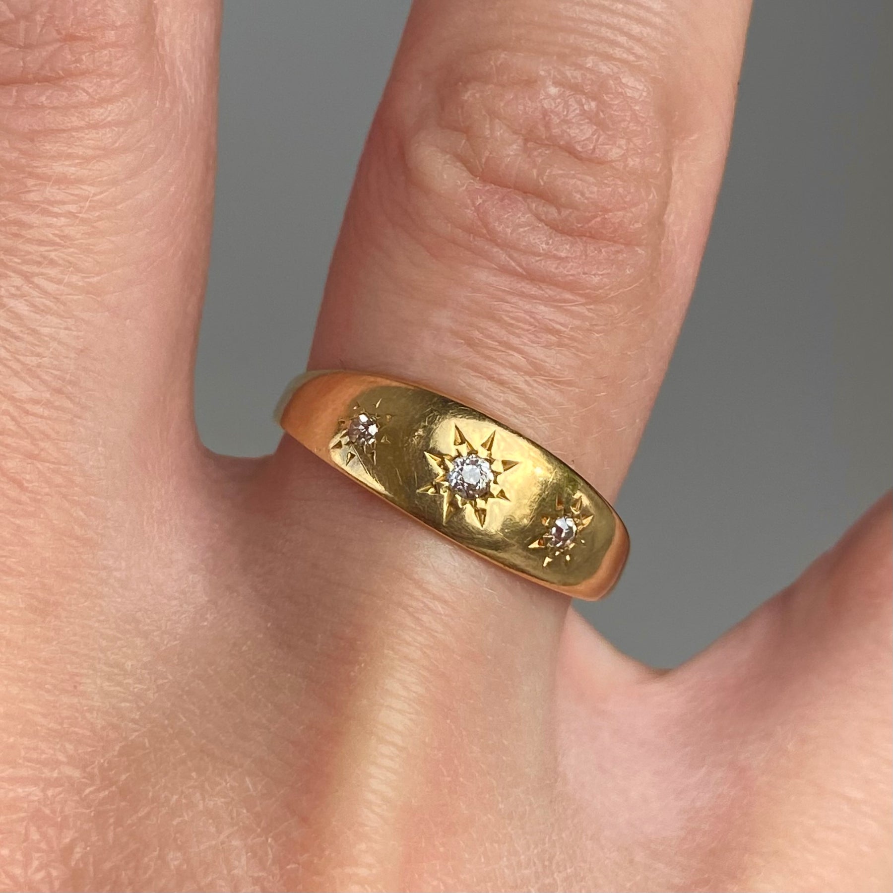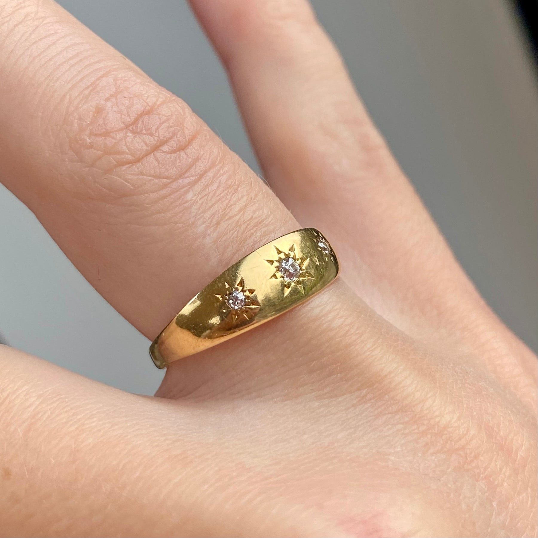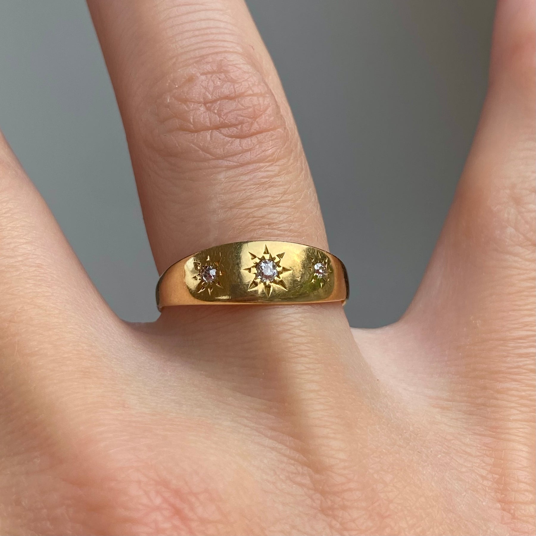 An 18ct gold Victorian ring set with three old-cut diamonds, each nestled within finely carved star settings. The warm, buttery gold enhances the sparkle of the stones, creating a beautiful contrast that feels both timeless and characterful. This classic star-set style is increasingly sought after and becoming harder to find, making it a charming and collectible piece of antique jewellery.