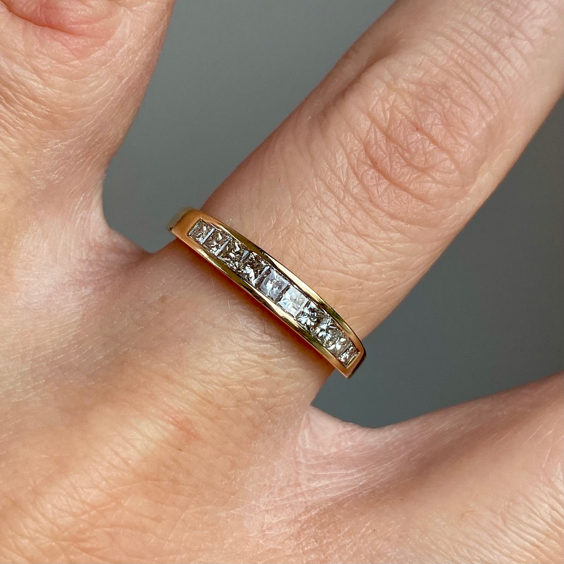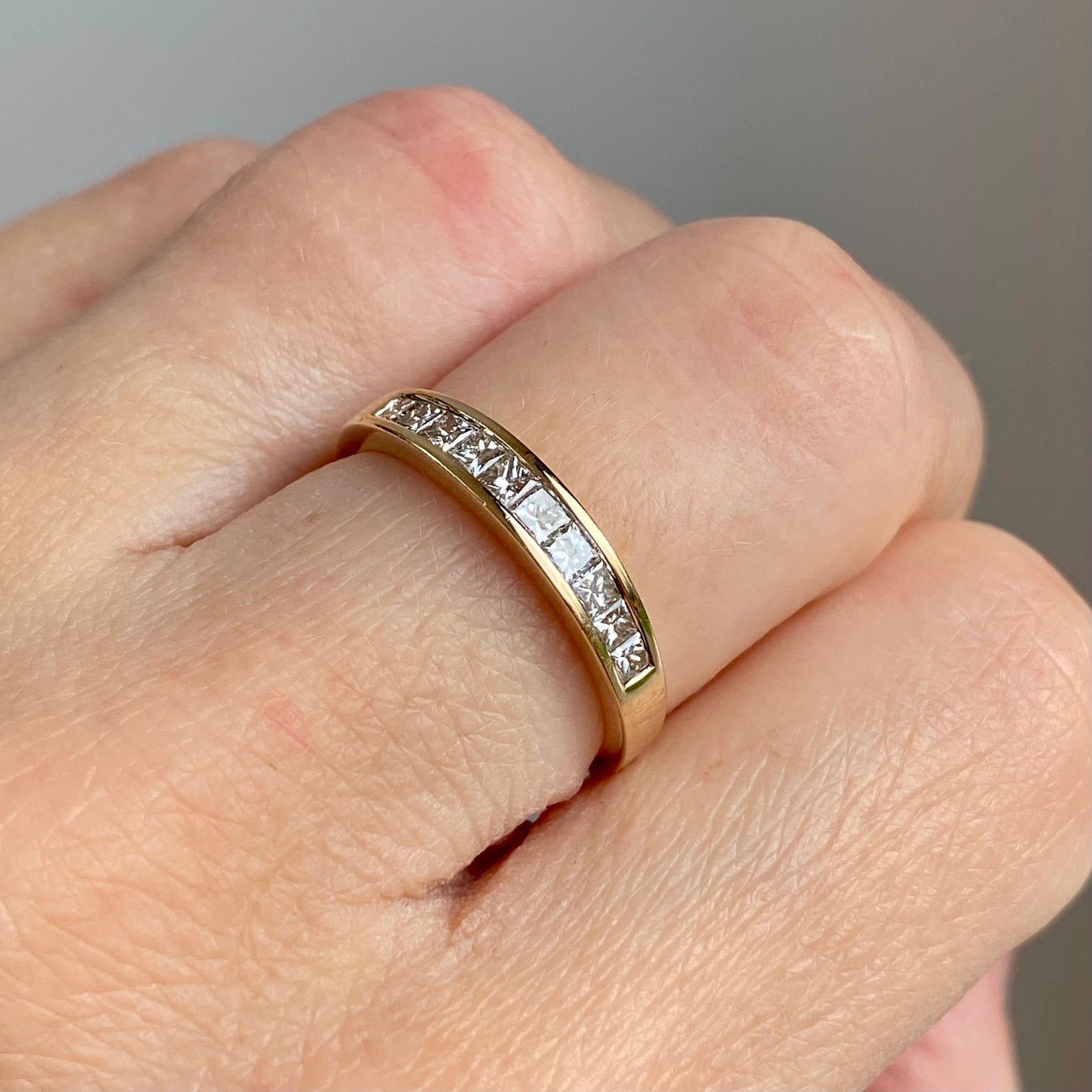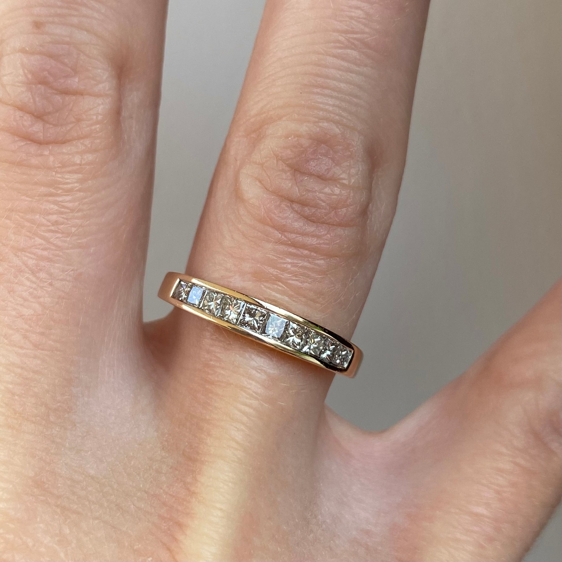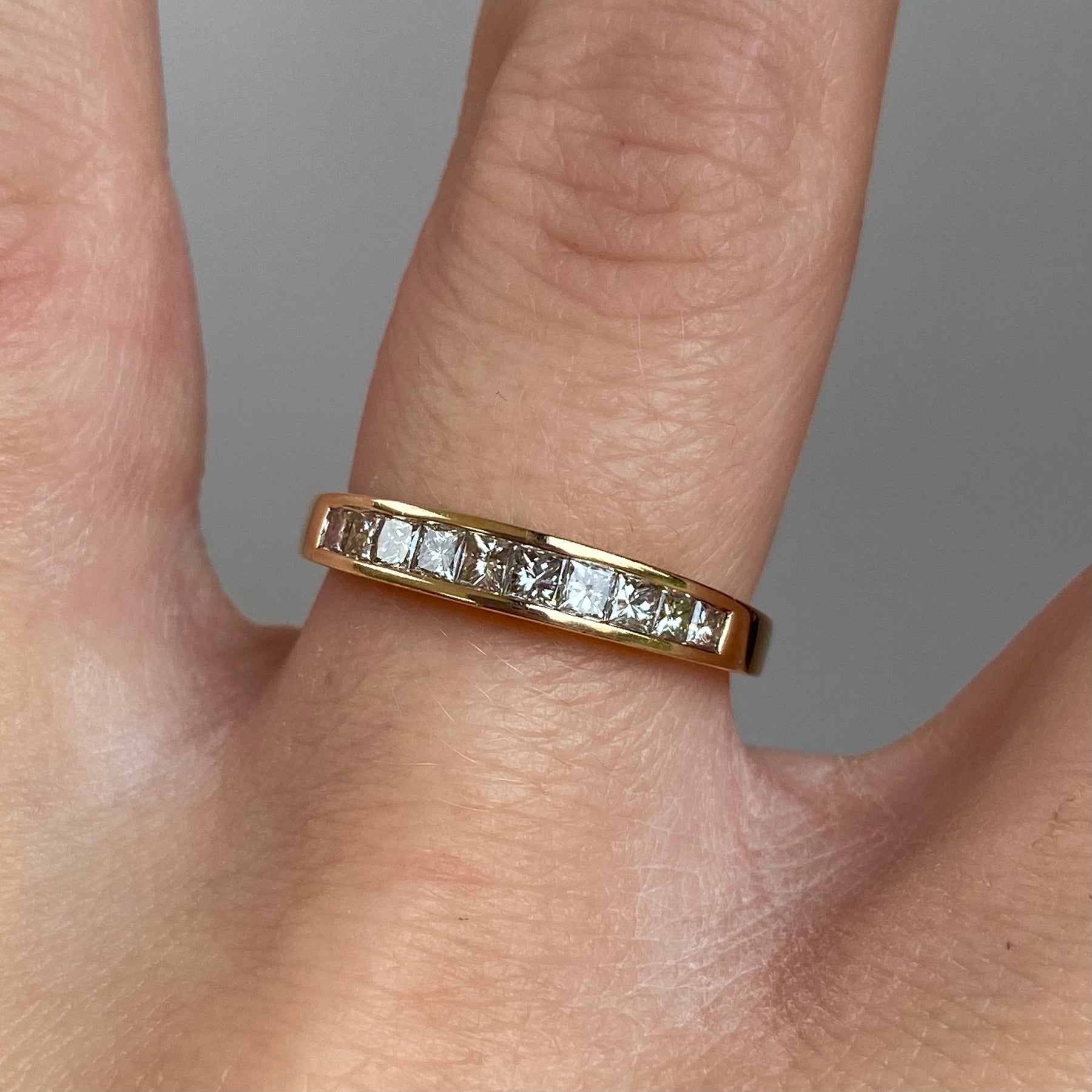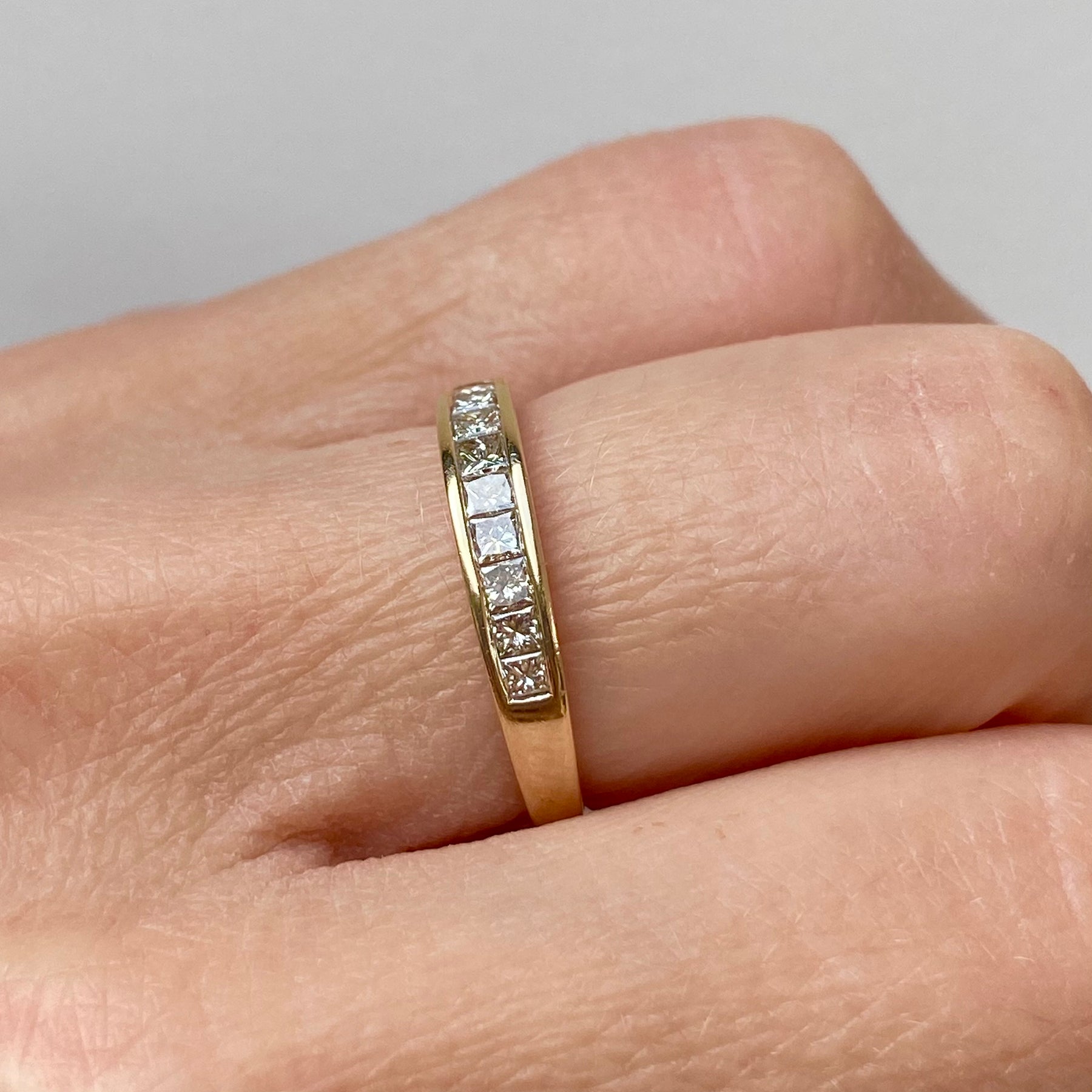 A 9ct gold vintage ring with 0.50 carat of princess cut diamonds held throughout the front in a chic row. The diamonds sparkle beautifully as light ripples through each stone whilst the ring is moved.